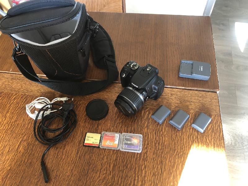 pour cause de passage au 1000D, je revends mon ancien EOS 350D complet et défiltré total, avec 3 batteries, un objectif 18-55 Canon, 3 cartes mémoires (1Go, 8Go et 32Go), chargeur, câble pour connecter à l'ordinateur ( reconnu sans souci par Win10 pour les transfert de photos ) et sacoche de transport.