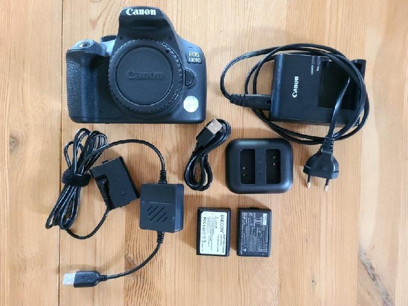 Vendu avec objectif EFS-18-55mm, 2 batteries, 2 chargeurs (l'un USB, l'autre 220V) + boitier alimentation via adaptateur USB (voir photo)