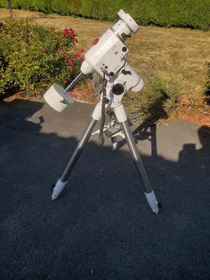Elle est accompagnée du trépied d'origine, de 2 contre poids, du cable eqmod, d une réhausse et de la télécommande.