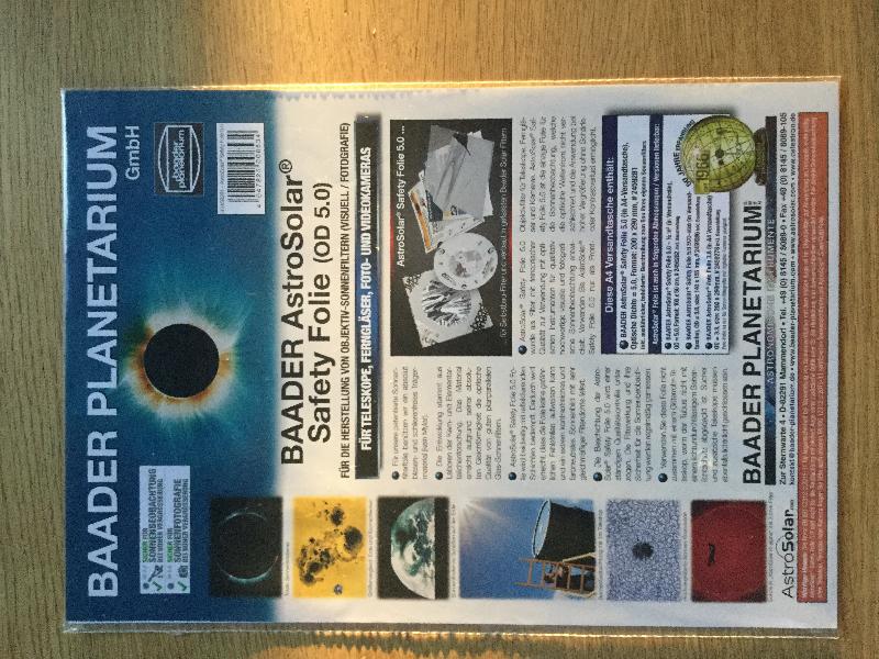 Feuille solaire Baader Astrosolar neuve, format A4.