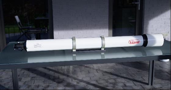 La lunette est fournie avec ses anneaux de fixation Vixen gris d'origine et un jeu d'anneaux blancs Vixen supplémentaires, munis d'une poignée. Outre le porte-oculaire d'origine pour oculaires de 1 1/4" (avec l'adaptateur Baader inclus) et de 0,954", un porte-oculaire Crayford de haute qualité permet l'utilisation d'oculaires de 2". Les deux porte-oculaires sont doux et précis.