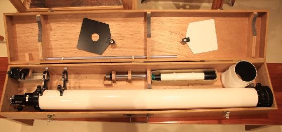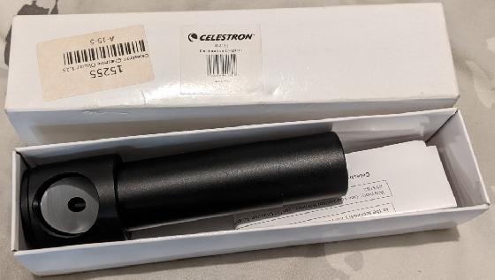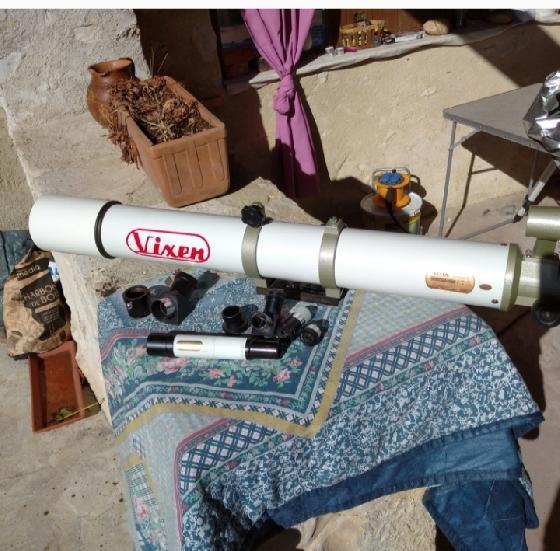 Il est en très bon état, équipé d'une queue d'aronde Vixen, un chercheur Telrad et un porte-oculaire 1"1/4 (31,75 mm ce qui est le standart actuel) et 1 oculaire Celestron de 25 mm (le grossissement est de 80x).
