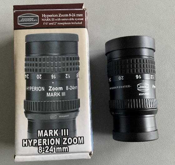 le 24-12-2025 par startarVends oculaire zoom Baader Hypérion 8-24 mm Mark III (attention : sans nez 1,25 " mais avec celui en 2") et Barlow Baader 2,25 pour Hypérion zoom, les deux en très bon état général. Offert en plus : une bague M56F/M54M. Prix de l’ensemble : 160 €, hors frais de port.