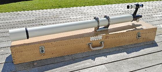 L'exemplaire vendue date de 1981 n° de série: 81276. Elle est fournie avec des colliers, valise, renvoi coudé 24.5 et adaptateurs nikon. En plus il y a les accessoires pour la passer en 50.8/31.7 mais ce tube n'est pas facile à utiliser avec le coulant 50.8mm, préférence au coulant natif 24.5 ou 31.7. Le chercheur d'origine n'est pas présent, elle viendra avec un chercheur takahashi 7X50 qui est du même niveau.