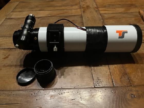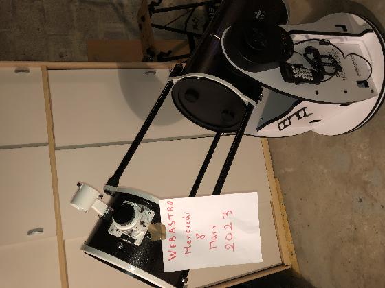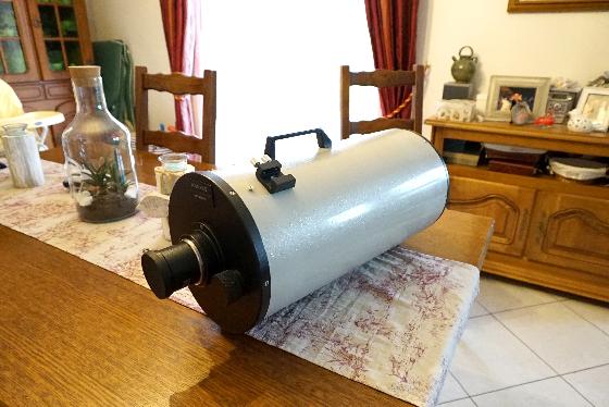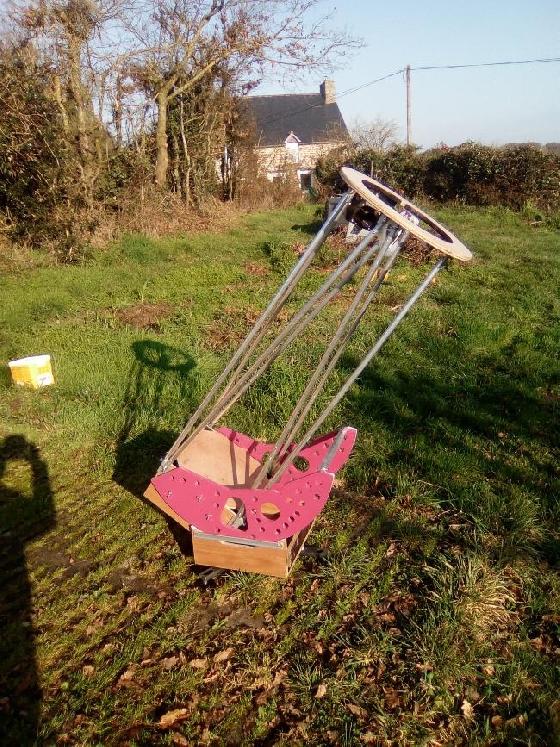 Structure Dobson de voyage, base annulaire, 8 tubes carbone 14 mm, porte oculaire Moonlite CR2. Secondaire TS-Optics (elliptical - D=70 mm, épaisseur 12mm, 94%).