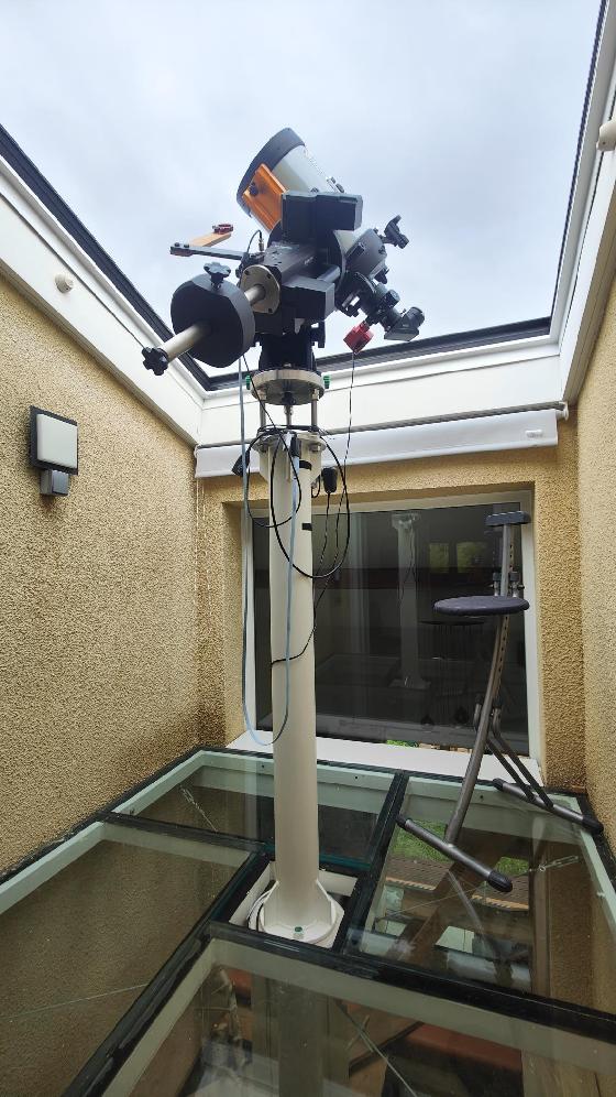 Vous pouvez voir des photos de l’installation de l’observatoire intégré à la maison dans un puits de lumière donnant accès au toit moyennant une ouverture motorisée télécommandée.