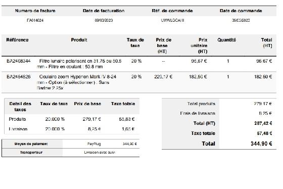 NB : FDP offert si paiement par lien bancaire personnalisé ou virement instantané