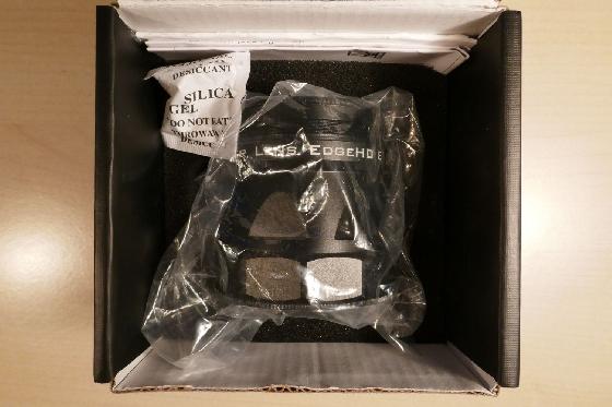 - 1 tube de télescope Celestron C8 Edge HD (réf 91030-XLT) – diamètre 203 mm / focale 2000 mm / rapport F/d 10) équipé d’une queue d’aronde type Losmandy, d’un chercheur 9 x 50 mm, d’une sortie classique vissante pour SCT (visual back 31,75 mm), d’un renvoi coudé 31,75 mm, et d’un oculaire Celestron Plössl de focale 40 mm