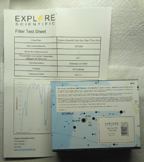 le 27-11-2025 par vhastroVends Filtre Dark-Sky 77 mm Slim NEUF EXPLORE SCIENTIFIC + Bulletin de contrôle avec emballage d'origine