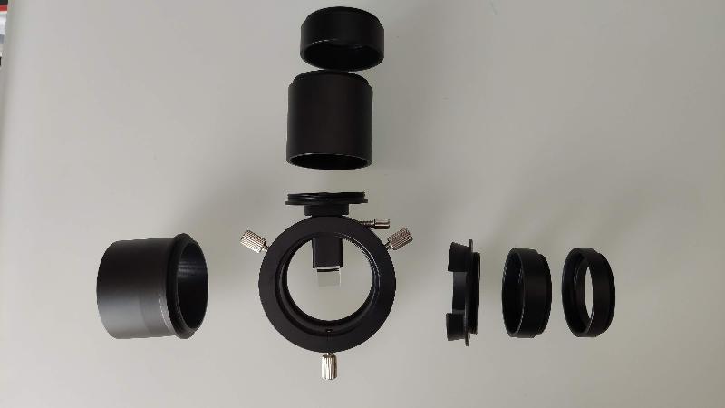 4 tubes bagues allonges (longueurs 8, 10, 15 et 40 mm) en M42 permettent d'adapter la distance focale des 2 caméras car elles peuvent être positionnées indifféremment sur les 2 sorties (voir photos), cela facilitant la mise au point focale des deux caméras.