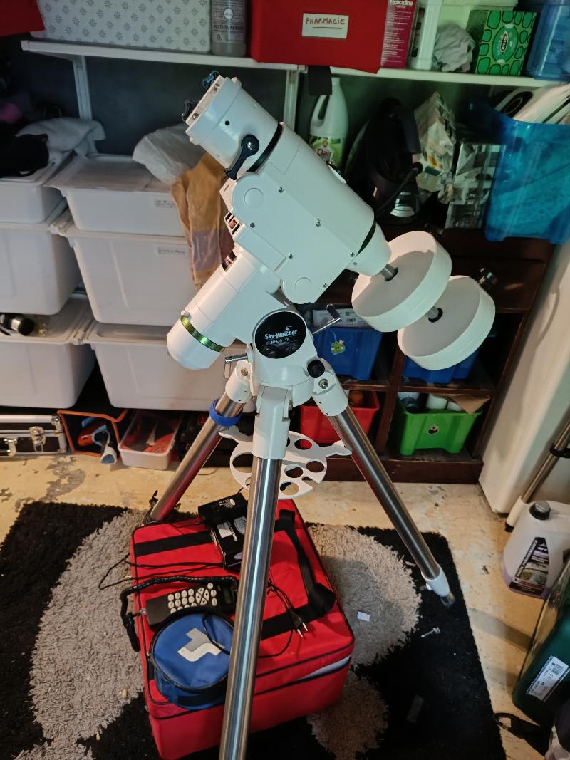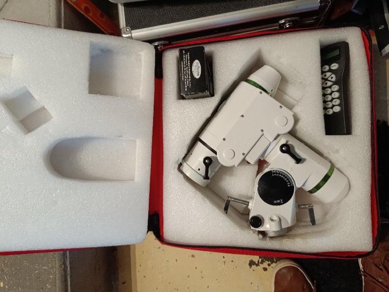 - la monture HEQ5 Pro GOTO + son trépied + ses 2 contrepoids + sa raquette + le mode d'emploi et la facture