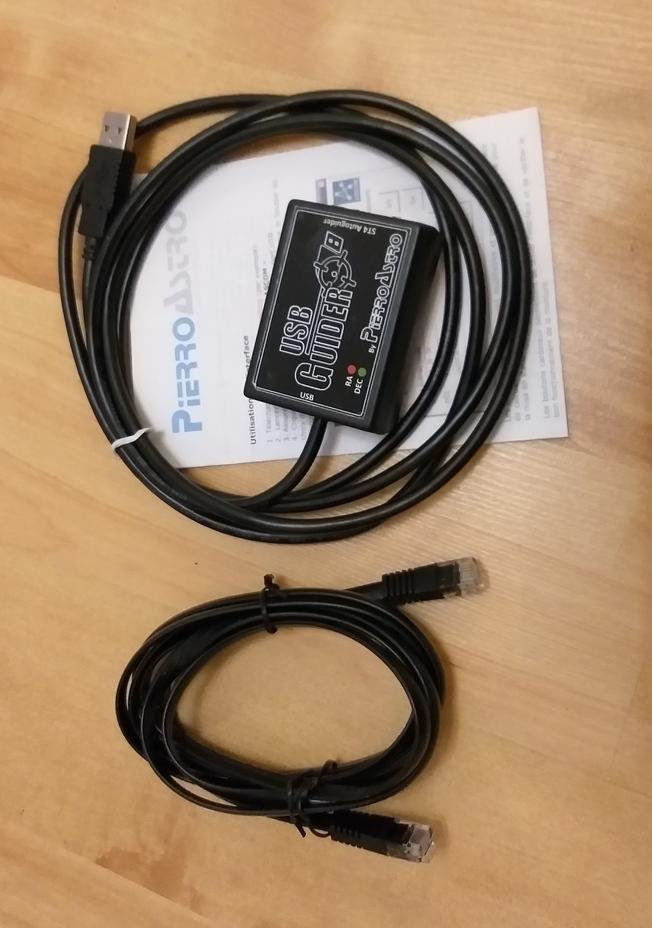Suite à un changement de monture, je vends une interface USB - ST4 "USB Guider" de chez Pierro Astro, avec câble ST4, le tout en bon état.