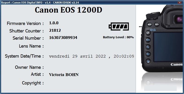 ✅ un canon 1200D défiltré partiel par Richard Galli (facture et encore sous garantie jusqu'au 31 mai 2022), 21 812 déclenchements (voir preuve shuttercount dans les photos), en très bon état, pas de rayures, pas d'impacts, rien ! Il a été choyé.