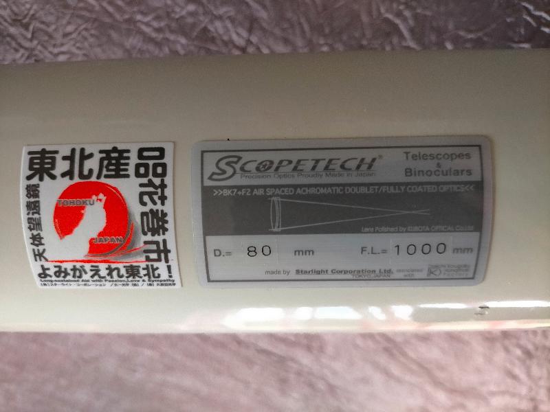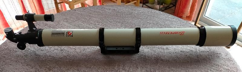 Lunette de marque Scopetech, fabrication japonaise, diamètre : 80 mm, focale : 1000 mm.