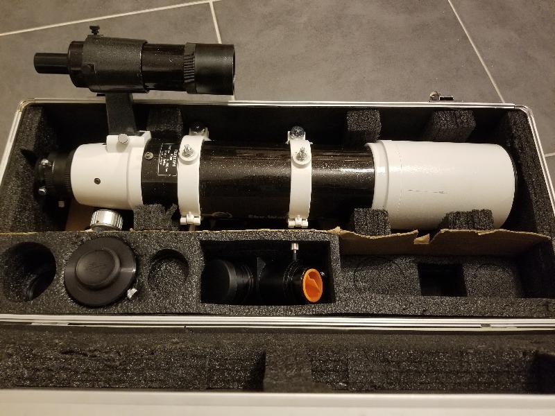 Lunette apochromatique Skywatcher ED80/600 EvoStar D.S. avec accessoires et valise de transport, l’ensemble en très bon état et sans défaut. Le pare buée à quelques traces d’utilisation (voir photo ci-jointe). Peu utilisé, est le motif de cette vente.