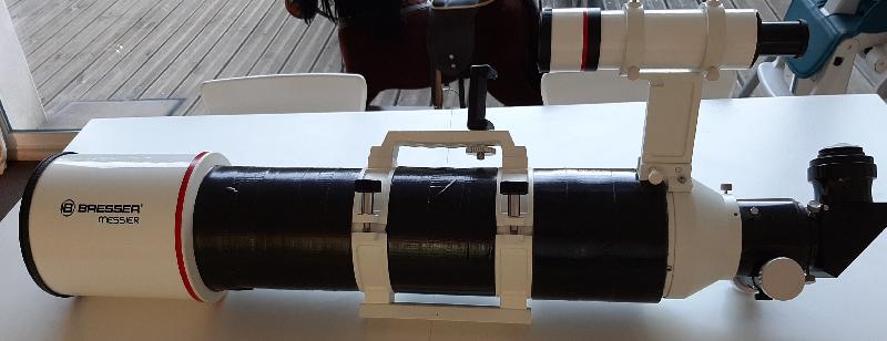 Vends lunette astro Bresser 127 / 635, renvoi coudé Omegon 2" 90°, démultiplicateur 1/10e, filtres rouge et bleu meade 1.25", filtre orange Baader 1.25"...