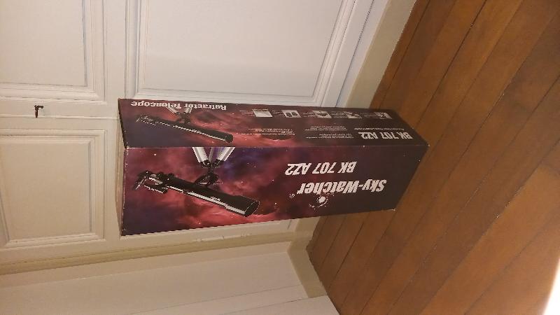 Lunette astronomique achromatique Sky-Watcher 70/700 monture azimutale. Oculaires 25mm et 10mm connexion 1,25 pouces ( 31,75mm ) fourni. Bon état, propre. Avec chercheur et trépied. Idéal pour débutants et/ou enfants. Observation des planètes, de la Lune et du ciel profond.