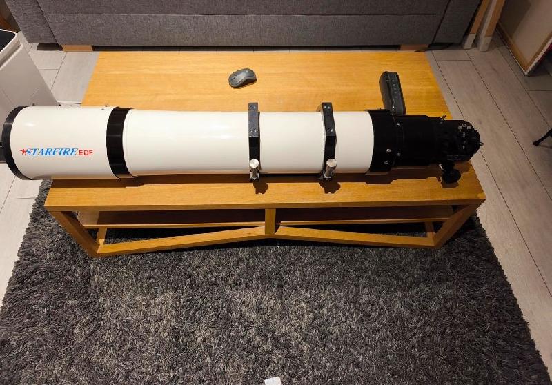 Vends superbe et rare lunette Astrophysics Starfire 155mm f7 en très bon état (optiques nickel et mécanique en parfait état, il y a quelques écailles sur la tranche du pare buée, assez fréquent sur ces modèles à pare buée réversible).