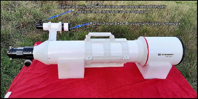 Il faut prévoir, 20 euros ( chez un revendeur comme Astroshop, par exemple...) pour remplacer la partie ''illuminateur à Led, pour chercheur Bresser'' qui ne fonctionne plus, (sur le chercheur 8x50 lumineux que j'avais acheté en plus) et que je n'ai pas pris le temps de commander.