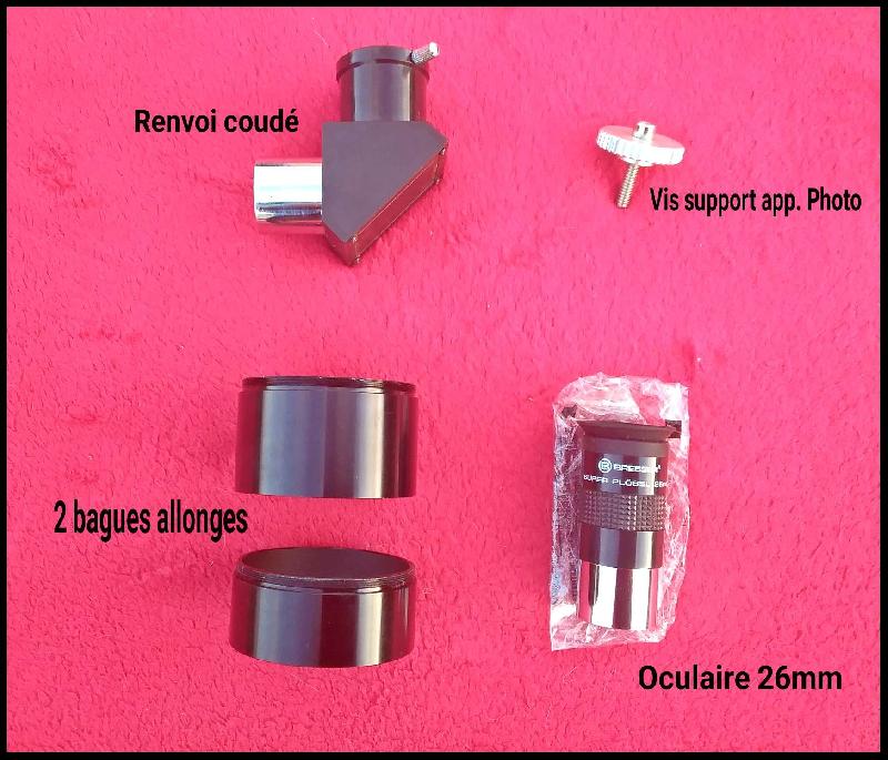 un chercheur Bresser 8x50 non éclairé, un renvoi d'angle de 31,75mm (1,25''), un oculaire Bresser 26mm (champ de vision 52 °), une "vis'' support pour app. Photo pour le solidariser à la poignée servant au portage de la lunette, 2 tubes allonges à utiliser en solution photo afin d'aller chercher le bon backfocus en les plaçant (vissage) entre la sortie du focuseur et les adaptateurs 50,8mm (2'') et 31,75mm (1,25'').