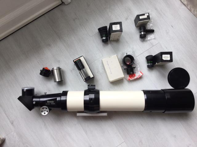 Equipé de: renvoi coudé 50.8 et réduction 31.75, pare buée rétractable, collier et queue d'aronde, oculaire Télévue wide field 15mm 65°, oculaire Télévue plossl 40mm, barlow Télévue 1.8 ,tube allonge coulant 50.8 ,un coté fileté pour bague T2, bague EOS, diviseur optique type Lumicon, oculaire microguide réticulé éclairé 12.5mm Baader. Le tout en parfait état, dans la valise d'origine Télévue, moulée grise. Photos complémentaires sur demande.
