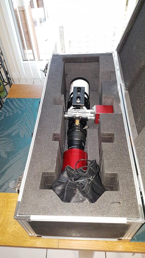 je n'ai plus la sacoche d'origine (très usée). je l'ai mise dans une valise métallique de récupération pour ne pas à avoir à démonter l'ensemble à chaque fois (lunette + aplannisseur + RAF+caméra).