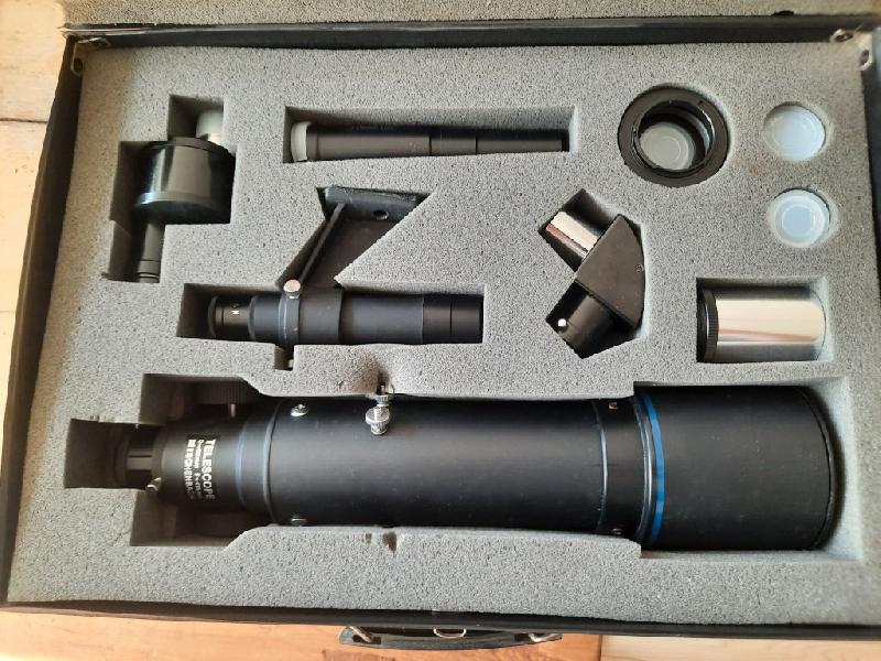 Avec sa mallette et ses accessoires : redresseur terrestre, renvoi coudé, chercheur, oculaires H20 et H6, filtres solaire et lunaire, barlow x2, adaptateur photo et tube allonge.