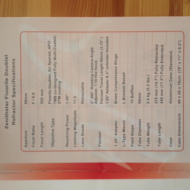 occasion Lunette Zenithstar Fluorite Doublet 80 mm Focal 555 mm focal Ratio F 6.9