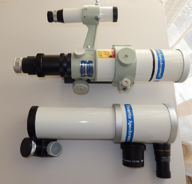 L'ensemble de deux lunettes en une est composée d'un tube complet FS-60CB. Son objectif peut se dévisser et l'on visser à la place le kit objectif de conversion FC-76DC. Un réducteur de focale x 0.72 permet de passer de l'ouverture 6 à 4.4 pour la petite lunette et de 7.5 à 5.4 pour la deuxième. Un renvoi coudé Takahashi et une barlow 2x font partie du lot.