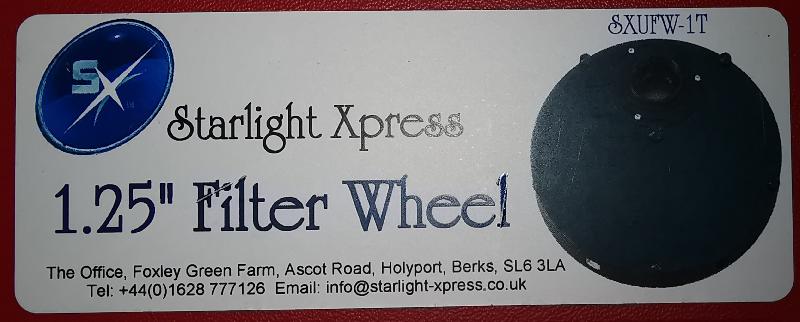 - Roue à filtre Starlight Xpress 7 filtres 1.25'' modèle SXUFW-1T (https://www.astronome.fr/produit-roue-a-filtres-motorisee-usb-starlight-xpress-Prix-0-euro-id-1176.html). 300€