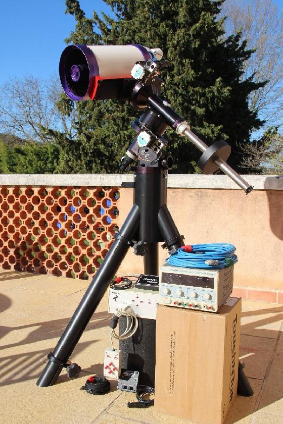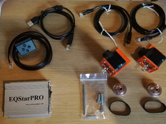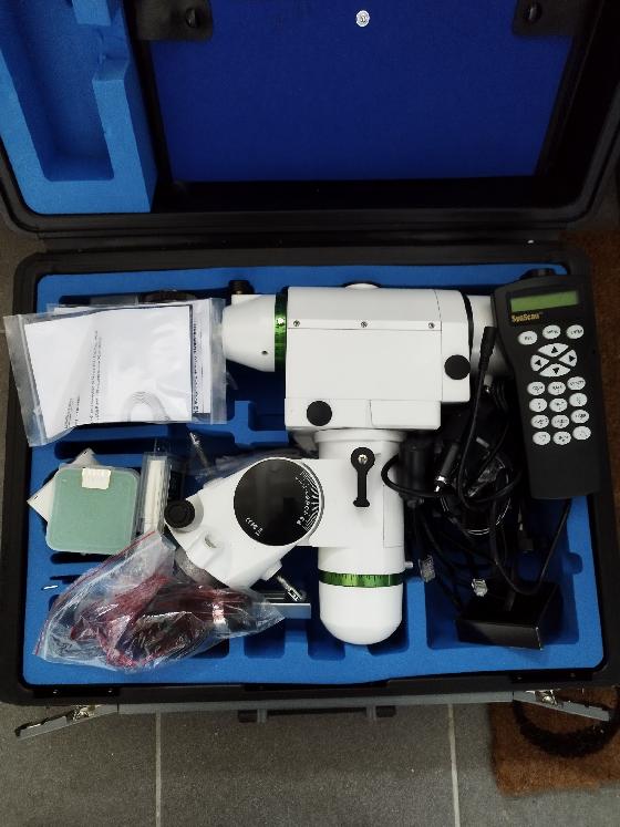 Correcteur de champ, bagues de fixation, queue d'arronde / sabot type vixen, pare buée, valise de transport, Alim 12V 6A, Cable Eqdirect Eqmod,chercheur coudé, renvoi coudé