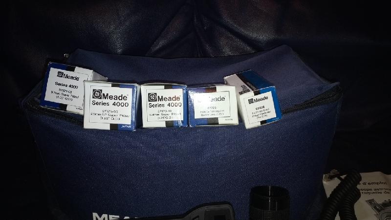 Inclus: occulaires Super Plossel Meade 26mm LP, 9,7mm et 6,4mm. Barlow Meade 2x. Chercheur Meade 8x21. Adaptateur photo meade. 2 raquettes 'ec'. Pieds 'ec'. Sacoche Meade.