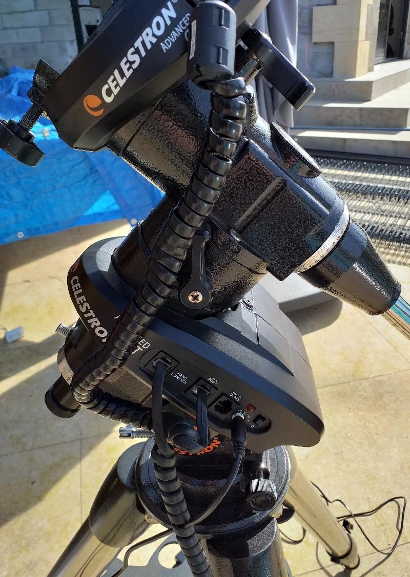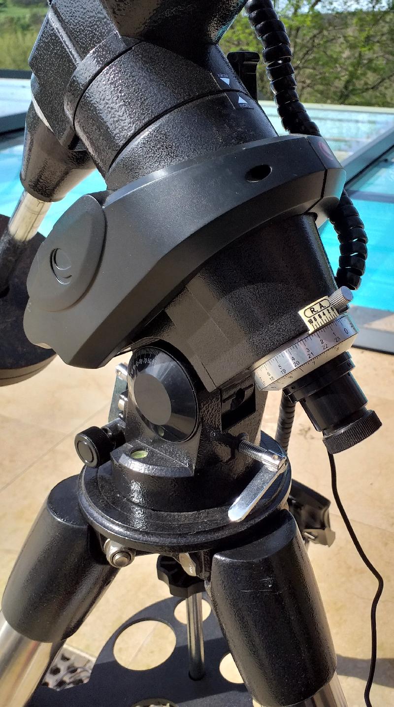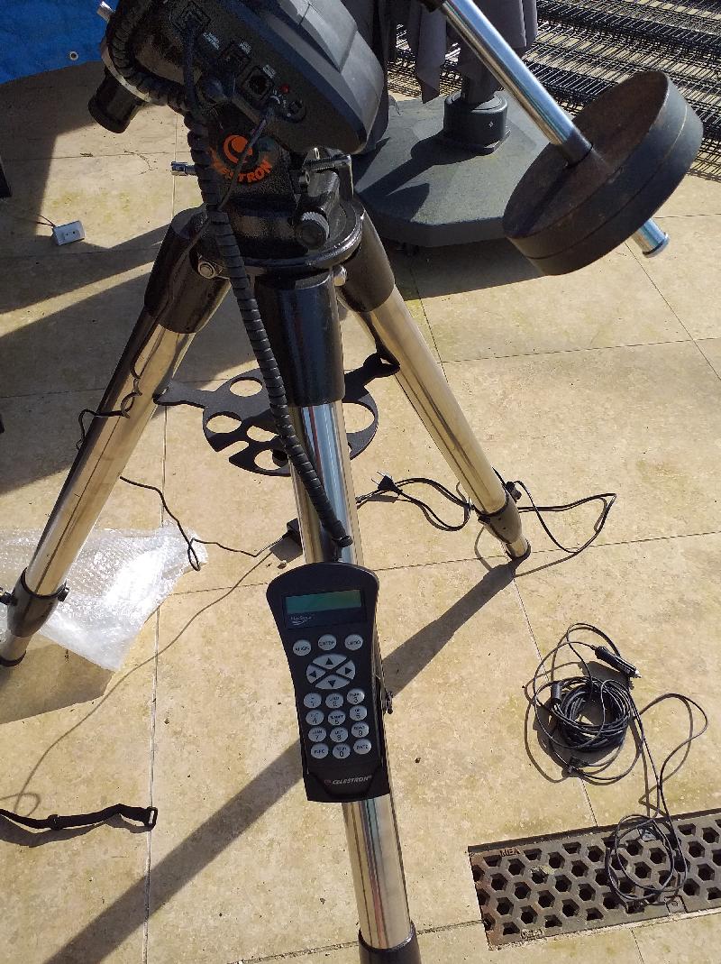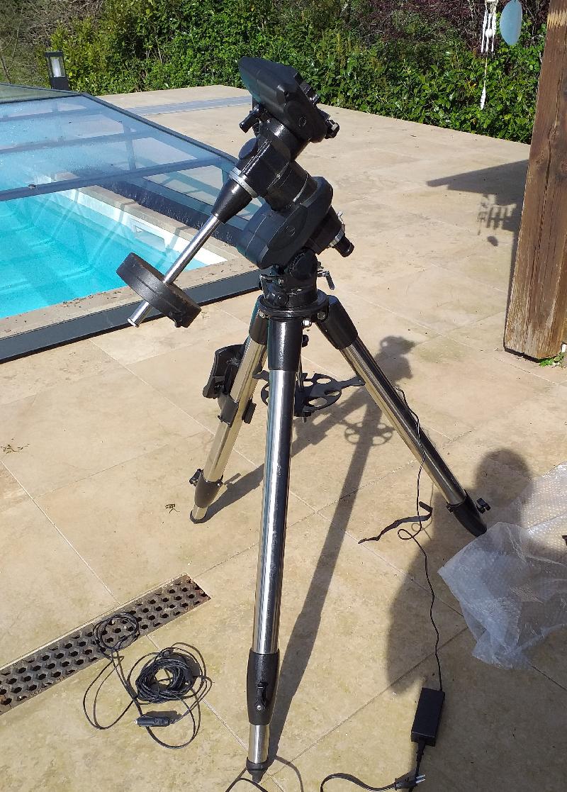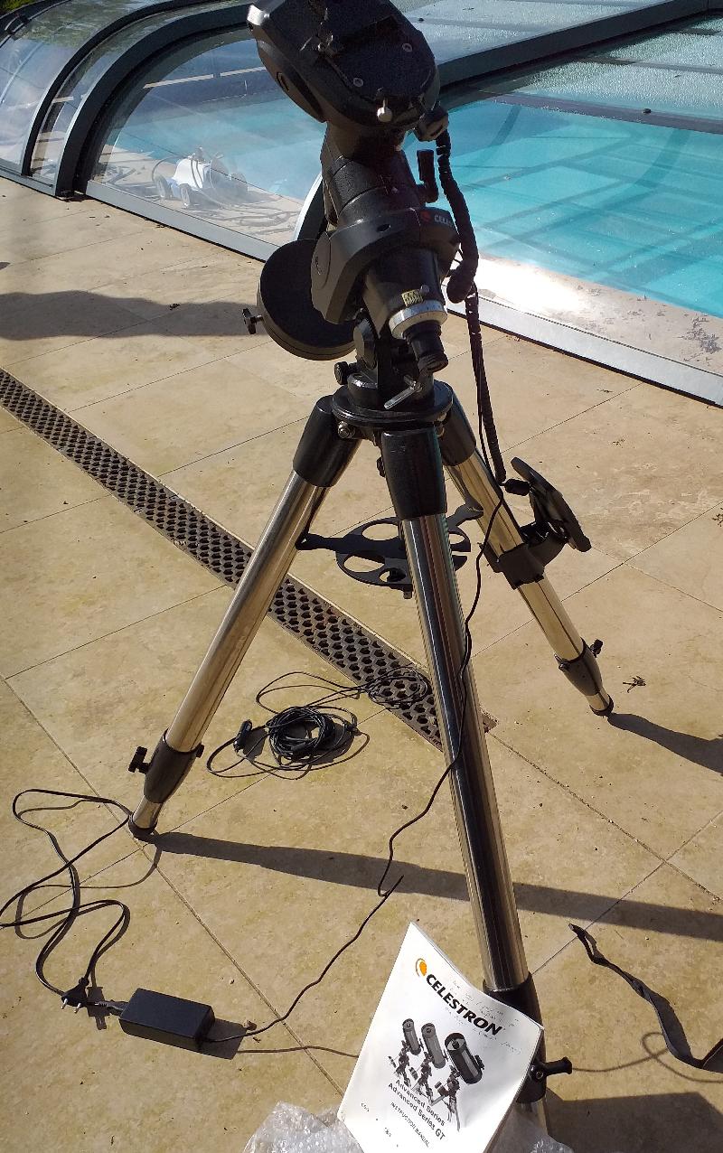 vends trépied celestron CG5 capable d'emmener un C8, occasion 10 ans; très ( très) peu servi ( car emmenait mal mon C11). Excellent état, fonctionnement vérifié. diamètre des pieds: 5 cm; réglable en hauteur; Livré avec viseur polaire; raquette Nexstar et son socle de trépied; niveau à bulle ( incorporé) ; tablette porte-oculaires; un contre-poids noir de 5 ,200kg; câble pour alim batterie et câble pour alim secteur; mode d'emploi; pas de boîte...;