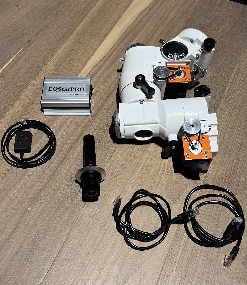 - ma monture EQ5 que j'ai motorisée avec le kit EQStarProEQ5. Le trépied et deux contre-poids de l'EQ5 sont fournis.