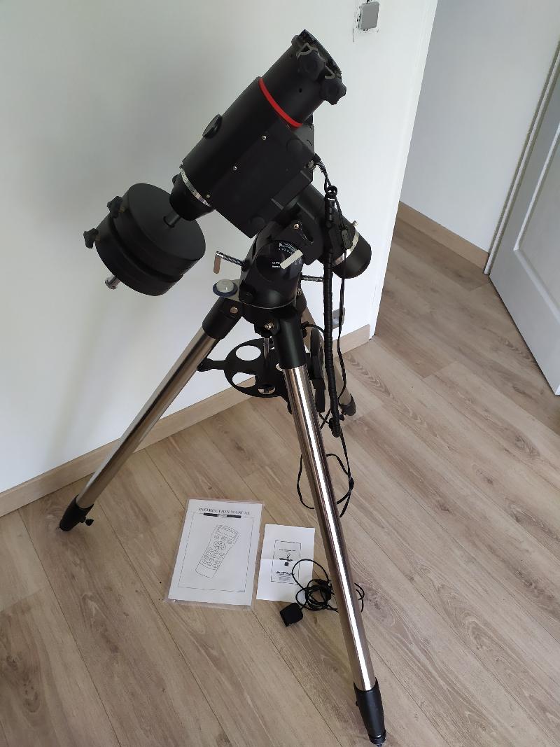 Vendu avec tous ces accessoires: raquette cordon+ câble alim+ 2 contrepoids de 5kg + plaquette en alu avec niveau à bulle pour réglage mise en station. Monture toujours stockée au sec après utilisation + livrets utilisation synscan et gps.