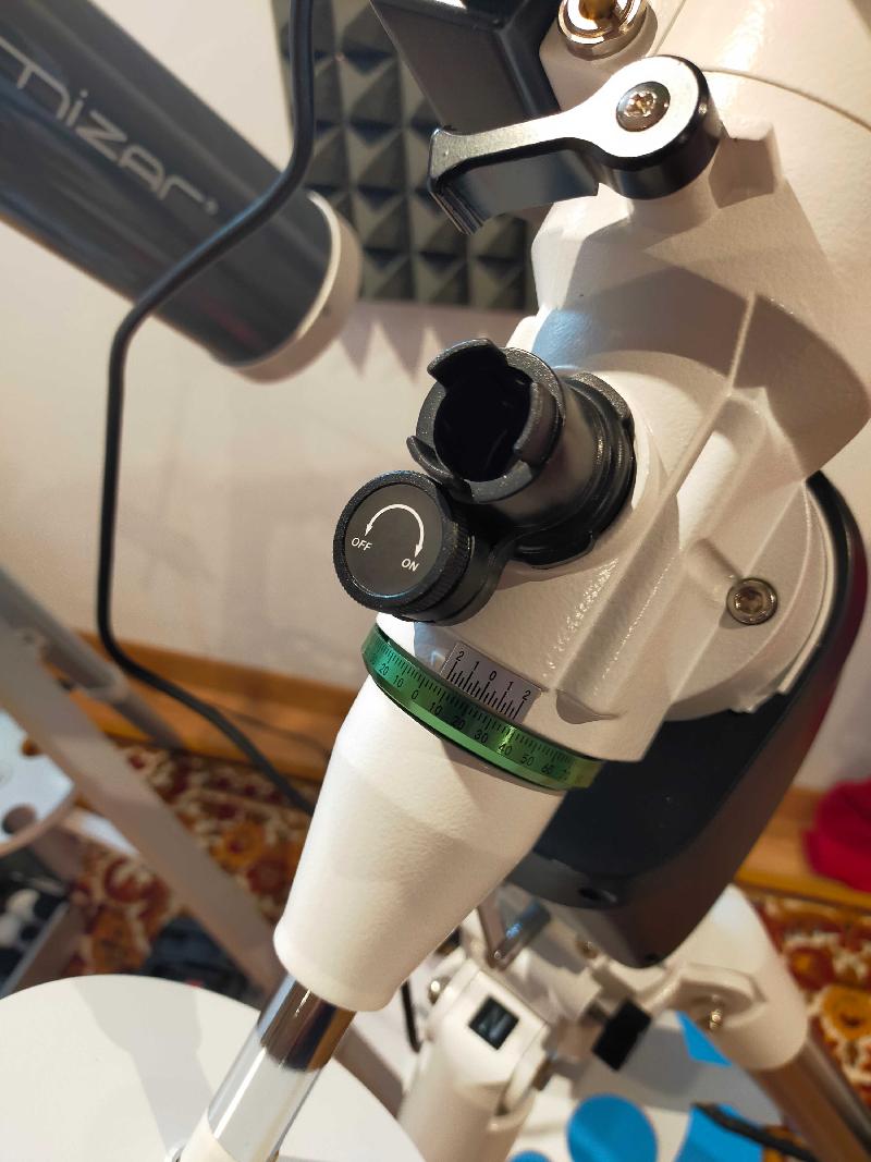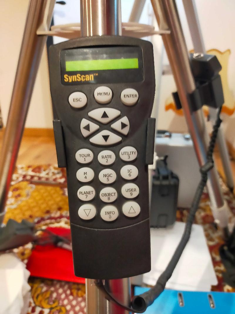 Elle est fournie avec son trépied tubulaire et les 2 contrepoids bien sûr,la raquette Synscan (j'ai encore tous les emballages du système goto), un viseur polaire (50 euros) et un éclairage de viseur polaire (38 euros) et une housse Geoptik pour la monture (40 euros)