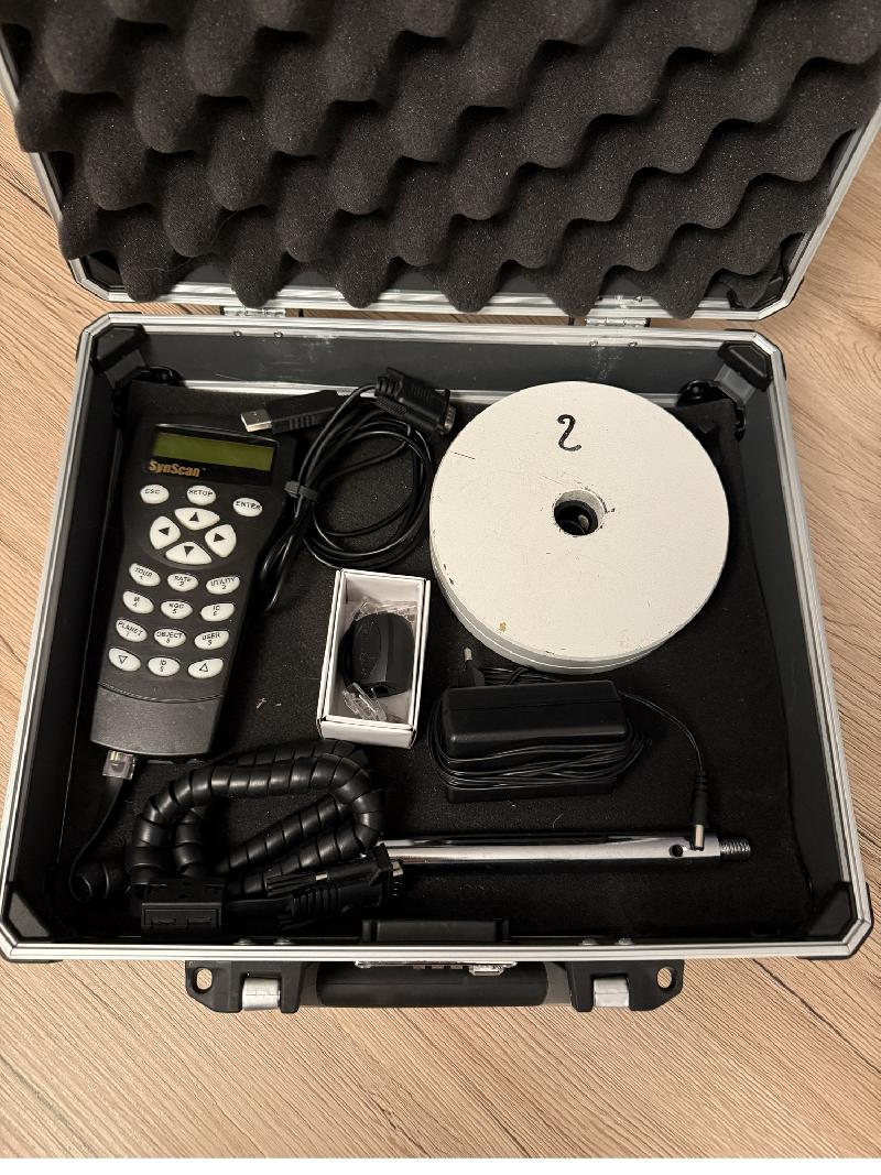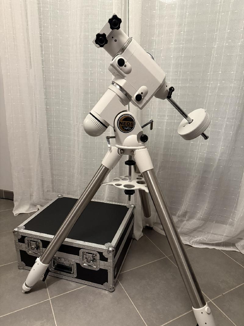 Monture, trépied, contre poids (2x5kg), raquette synscan avec son cable, Dongle USB synscan, cable eq mod (fonctionne avec Asiair), alimentation (2ah ok pour du visuel mais prévoir une 5ah pour suivi en goto)