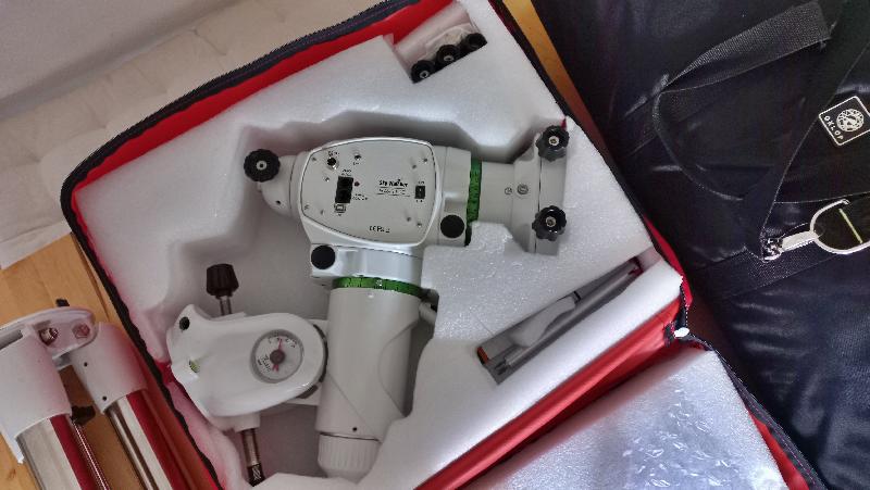 - Monture EQ6R Pro Go To avec raquette SynScan, adaptateurs pour batterie / secteur fournis, trépied Skywatcher, 2 contrepoids de 5 kilos, et sac de transport Geoptik acheté 40€