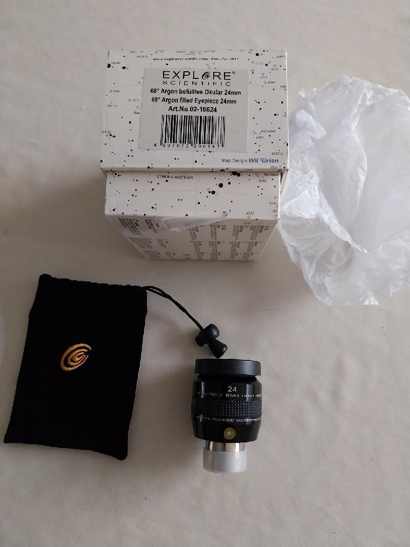 Je vends mon oculaire explore scientific 24mm 68°, coulant 31,75mm, complet boîte et capuchons d'origines, pas de défaut.