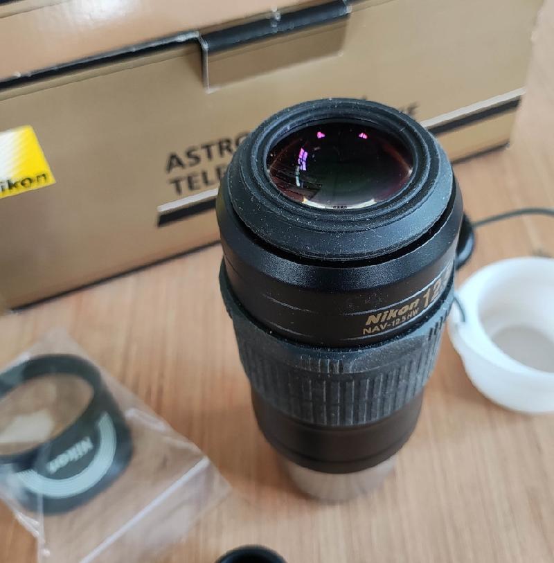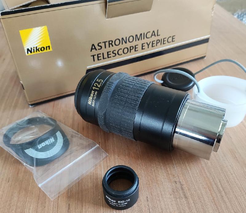 Oculaire Nikon NAV 12;5 mm 100° en excellent état, comme neuf, très peu servi, complet dans sa boite d’origine avec la bonnette jamais utilisée et l’Eic 10.