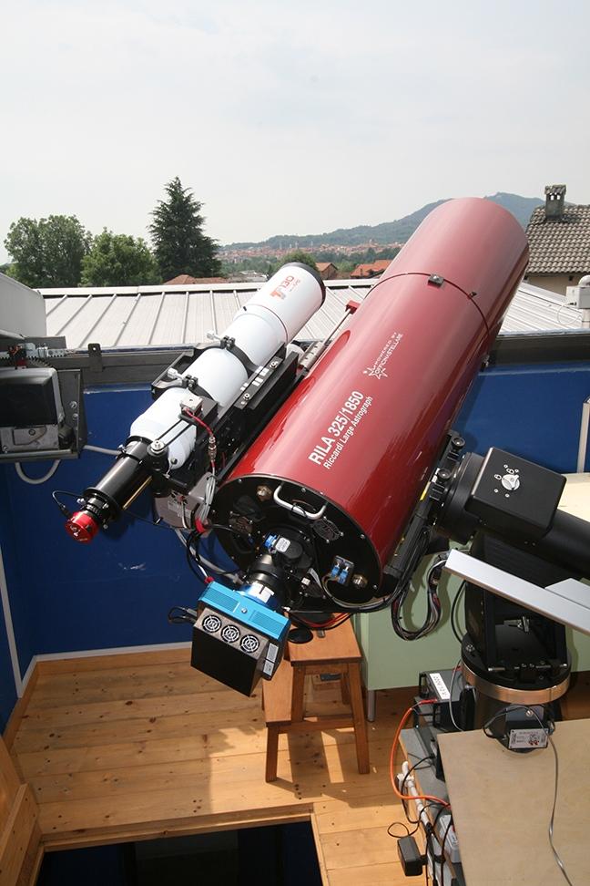 Astrographe pur avec un primaire de 350 mm (ouverture utile de 325 mm), un secondaire de 173 mm, un groupe correcteur ø84 mm avec 2 lentilles avant mise au point.