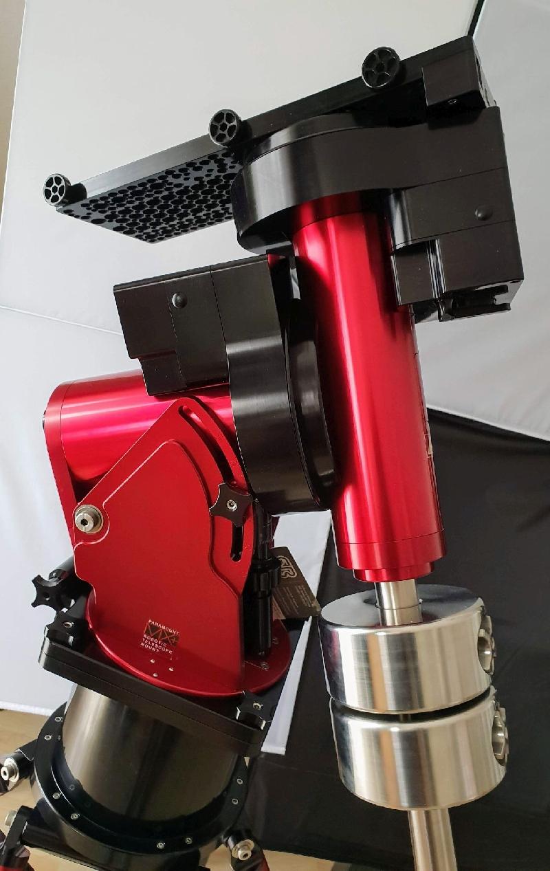 Paramount MX à vendre. Cela a été acheté l'année dernière et a les courroies d'entraînement gris plus récents. La monture a été utilisée environ 20 fois pour des applications visuelles étendues. Je prévoyais de l'utiliser pour AP bu 2 enfants de moins de 3 ans ont mis un frein à mes aspirations et la monture est en superbe état, avec une exception esthétique mineure. La plaque inversée fournie avec la monture est rayée le long de son axe. J'ai oublié de retirer les vis de sécurité de la queue d'aronde de mon télescope, et c'est ce qui s'est passé. Le scratch est purement esthétique. Tout fonctionne aussi bien que le premier jour où j'ai utilisé la monture. Tous les accessoires fournis avec la monture sont inclus. La monture est également livrée avec des numéros de série toujours actifs pour Tpoint et theskyx pro et des boîtes d’expédition originales
