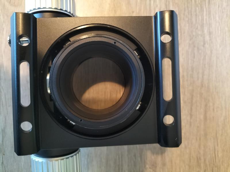 - platine de connexion au télescope. Dimensions : hauteur 115mm et largeur : 90 mm Espacement des entraxes de perçage : en hauteur 90 mm et 55 mm en largeur.