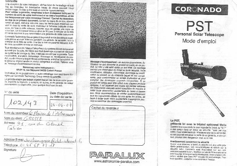 Je vends mon PST avec son oculaire, acquis en 2007 pour le prix de 700 €. Je n’ai pas pris le trépied car à l’époque il était vendu séparément. Quelques traces d’usures. La bague en caoutchouc a lâché. Je ne sais si il manque une vis sur le Fabry Perot (avis aux connaisseurs).