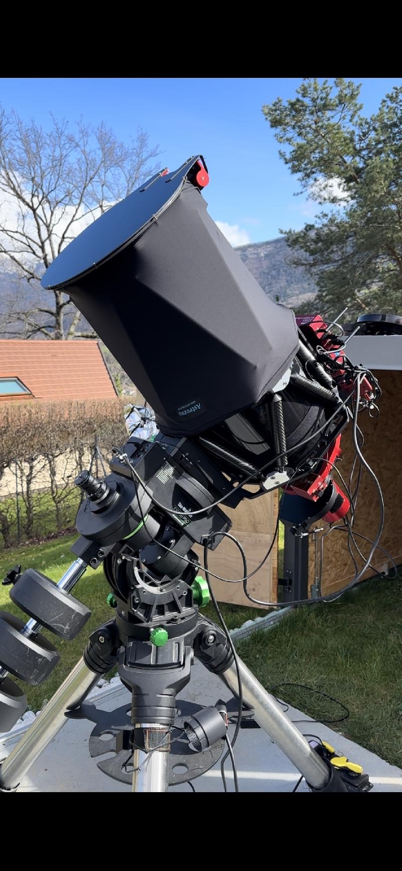 - Un télescope TS optics RC10" série spéciale acheté chez Univers Astro en Avril 2023 avec correcteur pour un rapport F/d = 6.4 avec son porte oculaire TS-Optics 3 Inch Rack and Pinion Focuser (bien meilleur qualité que le focuser TS de base) + kit pour montage de l'EAF ZWO + extension de bafflage TS (évite les reflet de lumière parasite) + jupe pare lumière astrozap + tous les accessoires d'origine (couvercle de protection des 2 miroirs, adaptateurs M68 vers M48, bagues d'extension M117, adaptateurs 2" et 1.25" pour utilisation en visuel, alimentation de ventilateurs). Ce télescope a été collimaté sur banc optique par Jean marc Lecleire: la Collimation n'a pas bougé. Il est utilisé en poste fixe et stocké dans un abris à télescope. Aucun choc et aucune dégradation. Il n'a jamais été exposé à l'eau et n'a jamais été démonté. le rapport de Collimation est fourni et atteste d'un miroir de très bonne qualité (GSO):