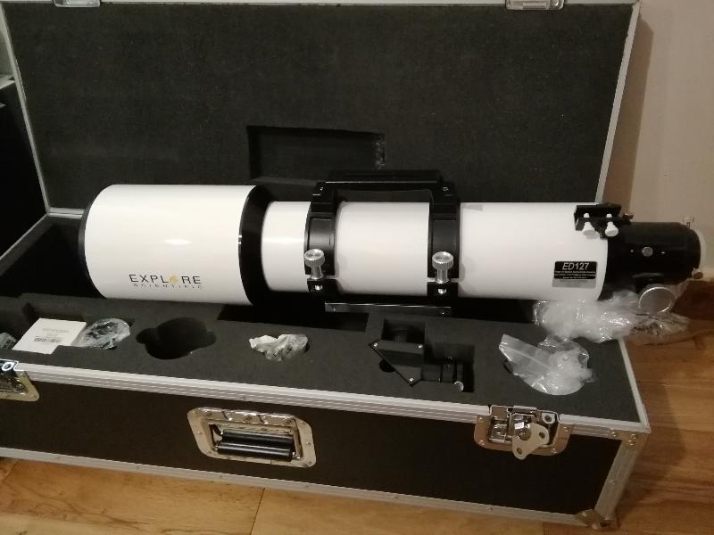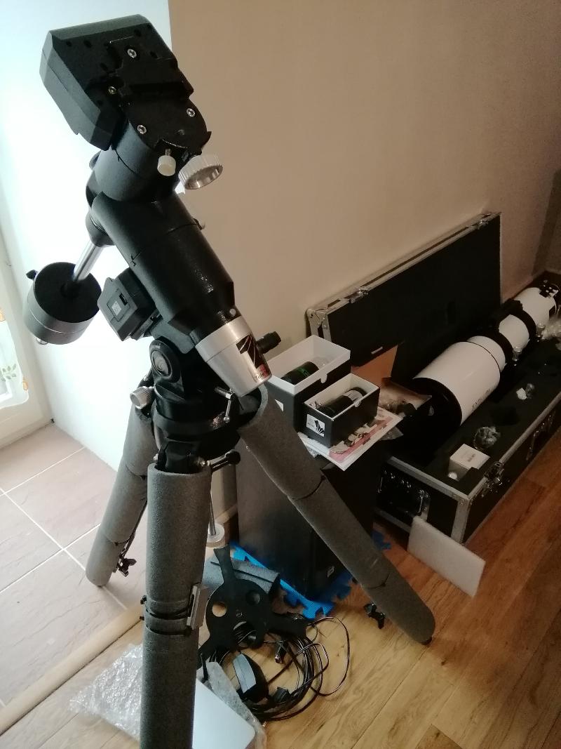 - Monture EXOS2 PCM8 avec 2 contrepoids (un seul suffit pour ce tube), protections mousse adaptées pour transport facile (et anti-reflets du métal), viseur polaire éclairé.