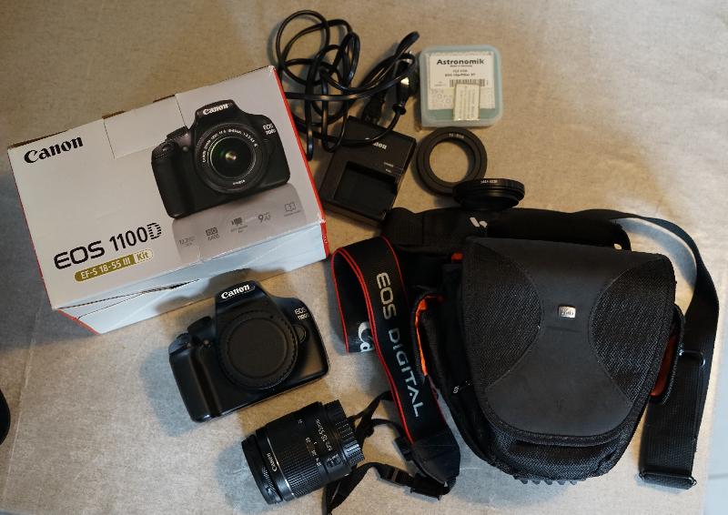 - Un appareil Canon 1100D défiltré total avec sa batterie, sa courroie, sa boîte et ses notices.