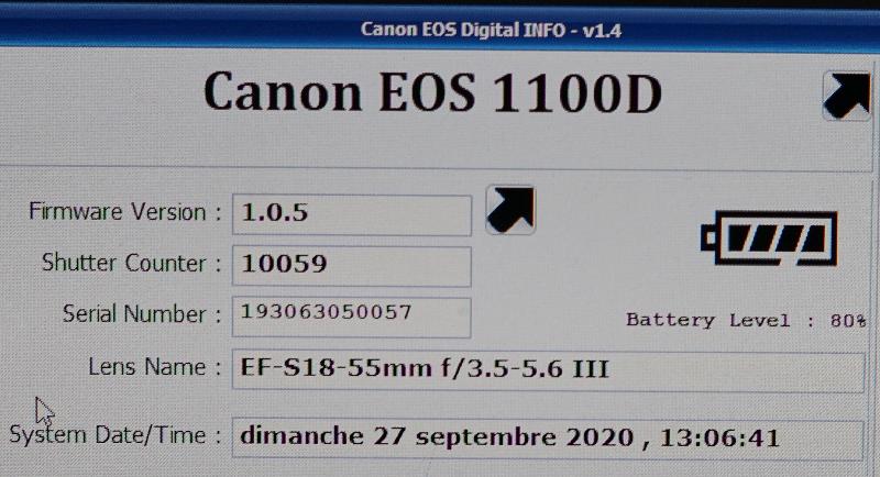 L’appareil photo a 10059 déclenchements et fonctionne parfaitement. Magic Lantern y est également installé.