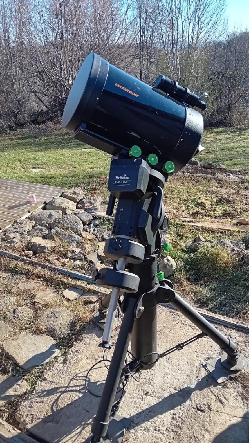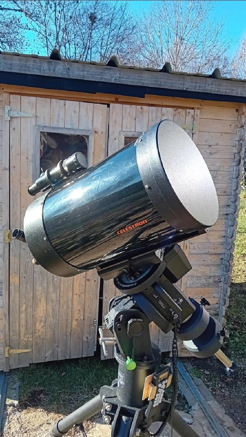 Le tube est équipé d'une molette de mise au point Feather touch (démultiplication 1:10), d'un pare buée Celestron, d'une résistance chauffante Kendrick pour C11, d'un diviseur réducteur Lumicon pour SCT ( à F/5,5 ou F/7,5 selon le choix de positionnement de la lentille réductrice), d'un renvoi coudé 1pouce 1/4 avec 4 oculaires super plosll 32, 26, 12,5 et 6,5 mm ainsi que 3 filtres colorés (rouge, bleu et jaune)