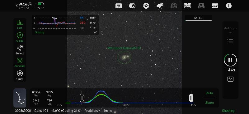 Par la suite, je l'ai utilisée avec un Asiair et, en fonction du seeing, son RMS est entre 0.8 et 1.3 pour le suivi.